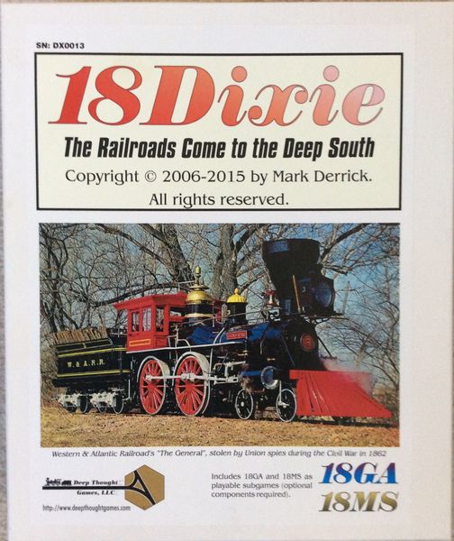 18Dixie with 18MS and 18GA is a board game released in 2015 by Deep Thought Games, LLC. Designed by Mark Derrick, this game falls into the economic, trains, and transportation categories. With a runtime of 120-150 minutes, it is suitable for 2-6 players aged 12 and above.
