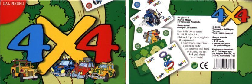 4X4 is a card game designed by Dal Negro and released in in 2000. It is a strategic set collection game that can be played by 2-4 players, with the best experience for 2-3 players. The game has a runtime of around 20 minutes and is suitable for players aged 10 and above.