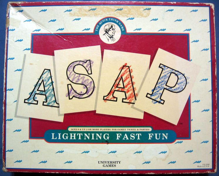 ASAP is a fast-paced board game that was released in 1987 by A. Robert Moog. It is a party game that can be played by 2 to 12 players, making it perfect for gatherings and game nights. The game involves a combination of trivia, word games, memory, and simultaneous action selection, making it both fun and challenging for players of all ages.