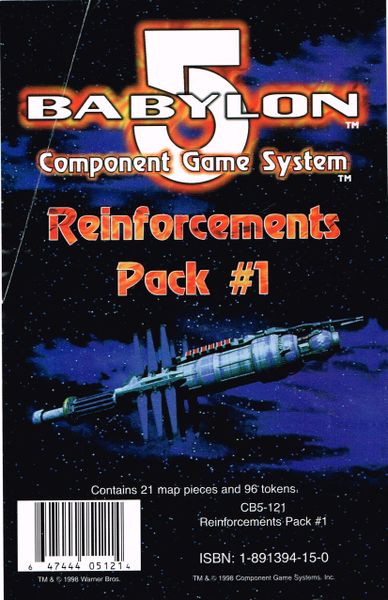 The Babylon 5 Component Game System: Reinforcements Pack #1 is an expansion for the base game that was released in in 1998. It is designed for 2 to 6 players, but it is best played with 2 to 4 players. The game is set in the universe of the popular science fiction television series Babylon 5, where players take on the roles of different factions vying for control in the conflict-ridden galaxy.