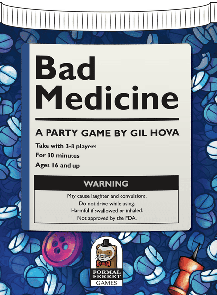 Bad Medicine is a card game designed by Scott Hartman and published by Formal Ferret Games in in 2015. It falls under the category of party games and is best played with a group of 4-5 or 8 players. The game revolves around players acting as pharmaceutical companies creating new drugs and pitching them to the public.