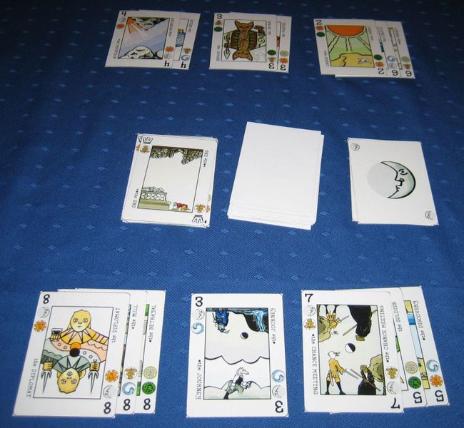 To set up Bharg, each player is dealt a hand of seven Decktet cards. The remaining cards are placed in a draw pile. The objective is to bind all the cards in your hand, which involves forming valid sets and runs using the Decktet cards.