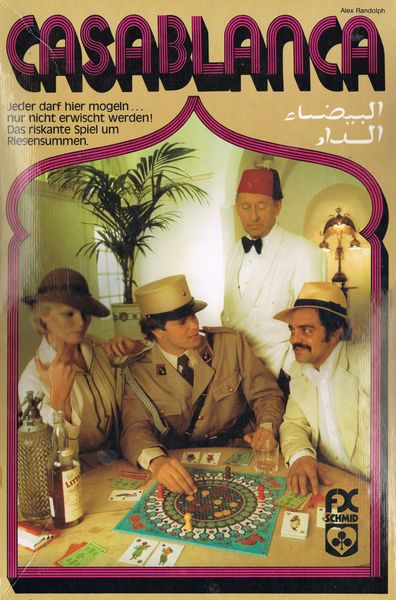 Casablanca is a classic board game released in 1977 by F.X. Schmid. It is a bluffing game designed for 2-4 players with a playtime of around 30 minutes. The game revolves around betting and bluffing, as well as set collection mechanics.