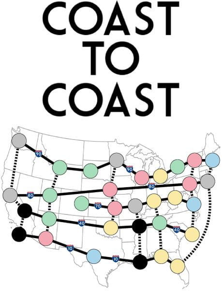 Coast to Coast is a board game released in 2020, designed for 1-5 players with a runtime of 15-30 minutes. It falls under the category of Number, Print & Play, and Travel games, featuring mechanics such as Bingo, End Game Bonuses, Network and Route Building, Paper-and-Pencil, and Set Collection.