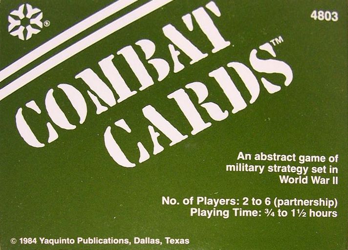 Combat Cards is a board game released in 1984, designed by Yaquinto. It falls under the categories of Card Game, Wargame, and World War II theme. The game is designed for 2 to 6 players, with a runtime of approximately 90 minutes. The gameplay involves hand management, open drafting, secret unit deployment, and is a team-based game.