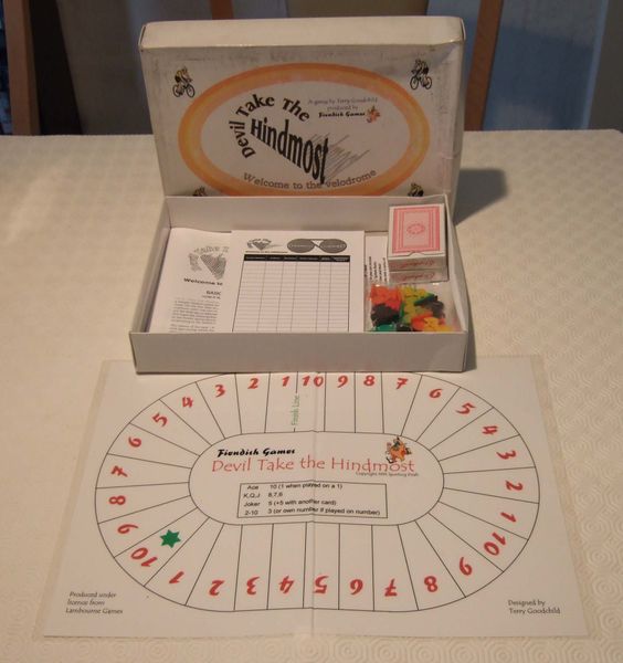 Devil Take the Hindmost is a classic card game that was first released in in 1991. It was designed by Terry Goodchild and published by Fiendish Board Games. The game is set in a racing theme, where players compete against each other to avoid being the last player in the race.