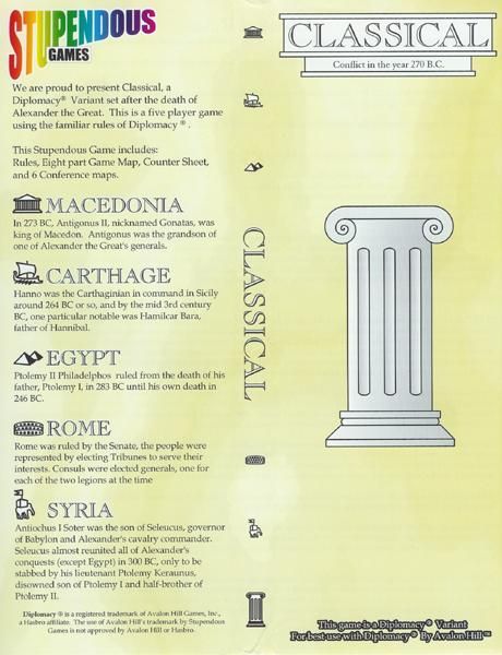 Diplomacy: Classical Variant is a board game released in 1998 by Stupendous Games. It is a variant of the classic game Diplomacy, which was first published in in 1998. The game is set in ancient times and focuses on diplomacy, negotiation, and political strategy. With a runtime of 360 minutes and designed for 5 players, this game is known for its intense gameplay and strategic depth.
