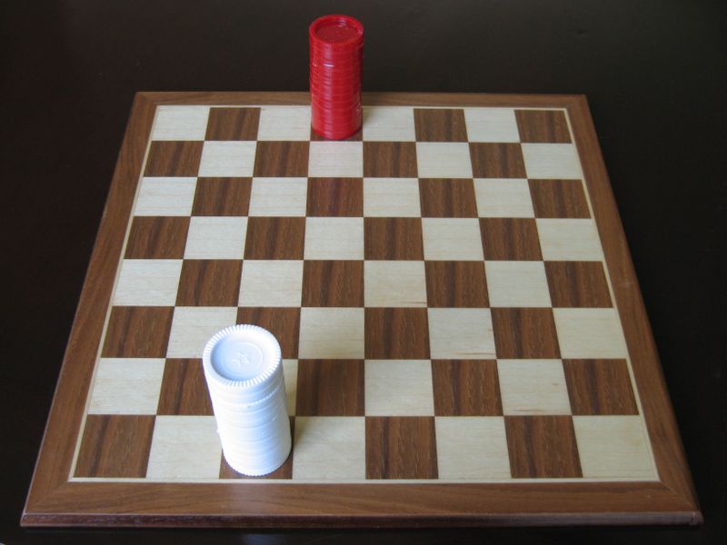 To set up the game, place two stacks of 12 checkers each on the dark squares of the checkerboard. Each player starts with their checkers on their side of the board.