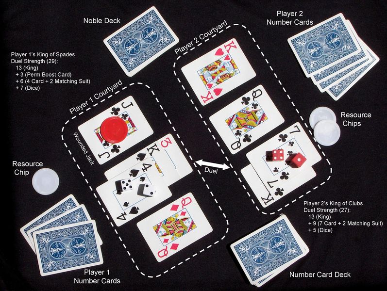 To set up the game, each player starts with a starting hand of cards and a Courtyard where their Nobles are placed. The objective is to prepare for duels by collecting and deploying the right combination of Noble and Support cards.