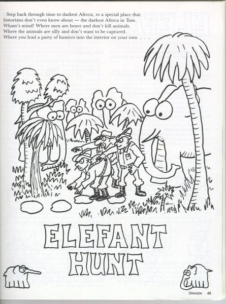 Elefant Hunt is a board game released in 1984 and designed by Tom Wham. It falls under the Adventure and Humor categories and is suitable for players aged 10 and above. The game features artwork by Tactical Studies Rules (TSR) and can accommodate 2 to 5 players, with the best gameplay experience with 4 players.