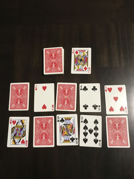 To set up the game, each player is dealt ten cards, one card at a time, which are arranged in two rows of five cards face down. The remaining cards are placed in the center of the table as a draw pile.
