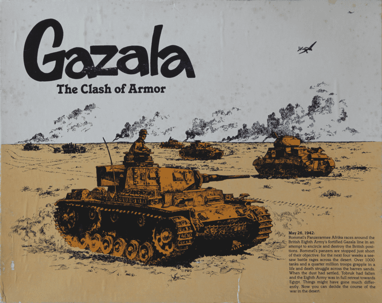 Gazala: The Clash of Armor is a wargame that was released in 1983, designed by Ina Clausen and Bruce Weigle. The game is set during World War II, specifically focusing on the Battle of Gazala that took place in North Africa in in 1983. Players take on the roles of commanders of the British and German armored forces as they engage in tactical combat on the desert battlefield.