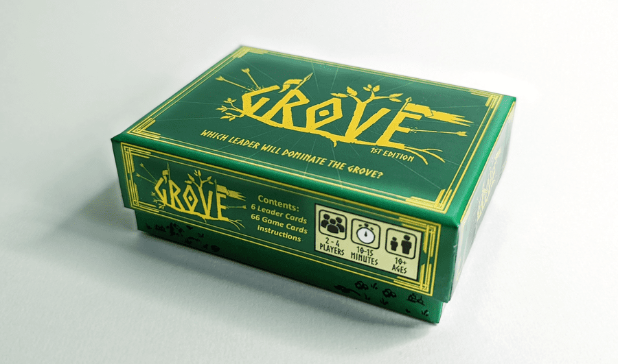 Grove is a card game designed by James Thompson from the UK and released in in 2022. It is a fantasy-themed humor party game that can be played with 2 to 4 players, with a best experience at 4 players. The game features mechanics such as end game bonuses, hand management, market, open drafting, set collection, and take that.