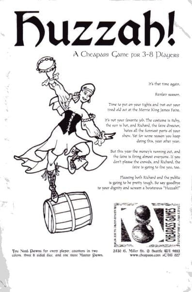 Huzzah! is a board game released in 1997 by Cheapass Games. Designed by James Ernest, the game is set in the Renaissance era and revolves around commodity speculation. With artwork by Toivo Rovainen, Huzzah! has gained popularity among print & play enthusiasts for its unique gameplay mechanics.