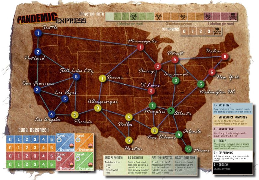 Infection Express is a cooperative board game released in 2009 designed by Andy Oakey. The game is centered around a medical theme where players work together to contain and eliminate infections spreading across a city.