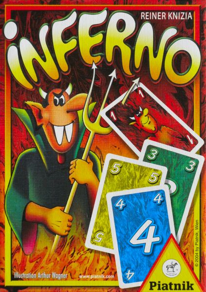 Inferno is a card game designed by Reiner Knizia and published by Fractal Juegos in in 2005. The game is designed for 3-7 players and has a runtime of about 20 minutes. Players take on the role of demons trying to collect souls and avoid being banished to the Inferno.