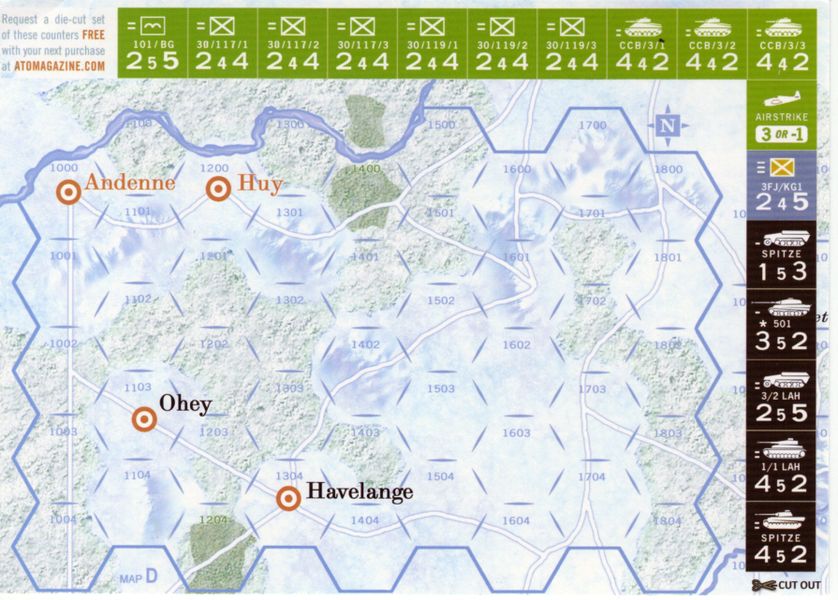 • Game Board:** Represents the terrain and key locations of the Battle of the Bulge.