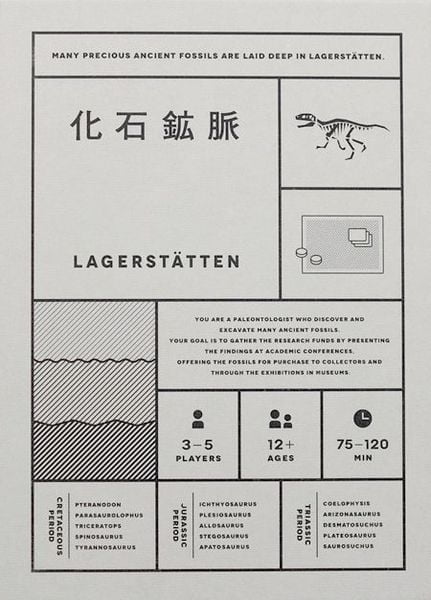 Lagerstätten is a board game designed by Masaki Suga and published by analog lunchbox in in 2017. The game is set in prehistoric times and focuses on exploration and set collection mechanics. Players take on the role of paleontologists competing to discover and excavate fossils in various locations.
