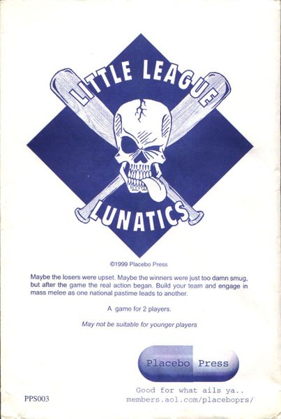 Little League Lunatics is a two-player card game that was released in 1999 by Placebo Press. The game is set in the world of little league baseball, but with a twist