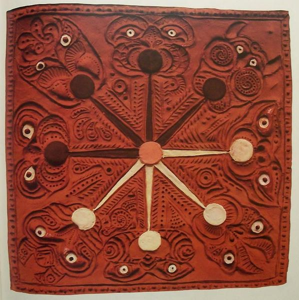 To set up the game, place the four counters of each player on adjacent points of the star. The central *pūtahi* is initially empty. For a DIY board, draw a large circle, add diameters to form a cross and then divide the quarters, connecting the endpoints with V shapes to form the star, and add a central circle.