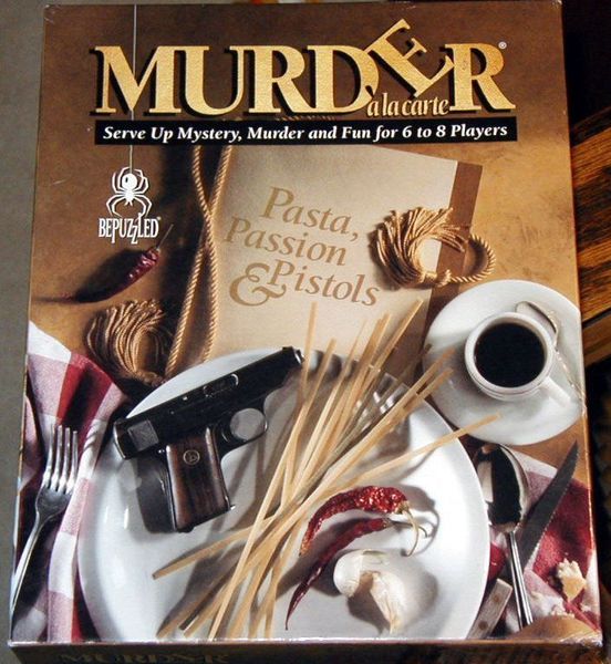 Murder à la carte: Pasta, Passion & Pistols is a murder mystery party game that was released in in 1995. Designed by Larry Zacher and published by bePuzzled, the game falls under the categories of Deduction, Murder/Mystery, and Party Game. With a runtime of 180 minutes, this game is designed for 6-8 players aged 18 and above.