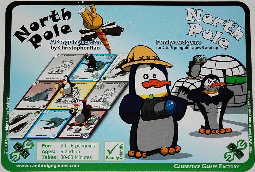 North Pole is a board game released in 2011 by Cambridge Games Factory. Designed by Christopher Rama Rao and illustrated by Mark Campo, the game is a blend of card game, exploration, number, and racing elements. With a playtime of around 30 minutes, North Pole is suitable for 2 to 6 players aged 9 and above.
