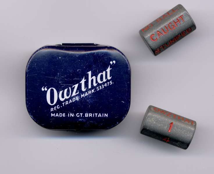 • Materials: Originally made of metal, later versions used white plastic for the batting die and green plastic for the bowling die. Ten red plastic disc counters were added to track fallen wickets.