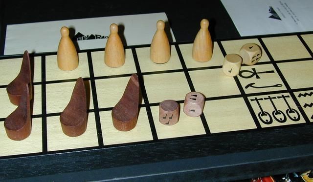 Board: Divided into three rows of ten squares each, called “Houses”.Pieces: Four playing pieces per player, shaped like the crowns of Lower Egypt (dark player) and Upper Egypt (light player).Dice: Two dice per player, one marked with silhouettes of the player’s own pieces and the other with silhouettes of the opponent’s pieces. The dice are marked 0 – 0 – 1 – 2 – 3 – 4 and 0 – 0 – 1 – 1 – 2 – 2.