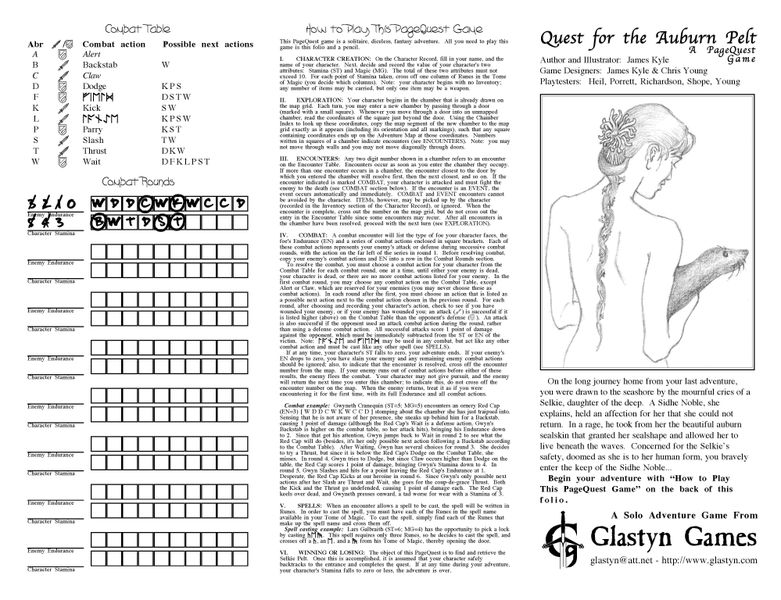 Quest for the Auburn Pelt: A PageQuest Game is a print-and-play adventure board game released in 1997 by Glastyn Games. Designed for a single player, this game combines elements of fantasy and adventure as players embark on a quest to retrieve the elusive Auburn Pelt.