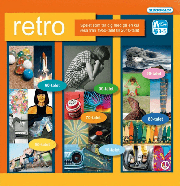 Retro is a trivia board game released in 2006, designed by Kisse Lindén and illustrated by Kärnan. It is a race-style game where players move around the board answering trivia questions to progress. The game is recommended for players aged 15 and above, with 3 to 6 players able to participate.