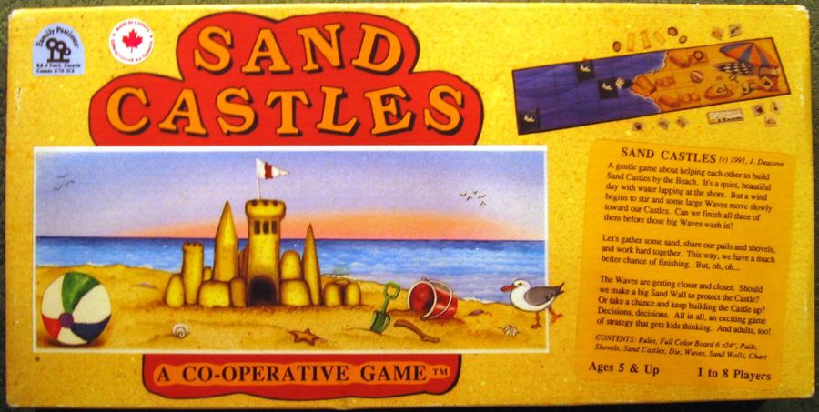 Sand Castles is a children’s cooperative board game designed by Jim Deacove and published by Family Pastimes in in 1991. The game is suitable for players aged 5 and up, with a playtime of around 20 minutes. In Sand Castles, players work together to build sand castles before the incoming tide washes them away.