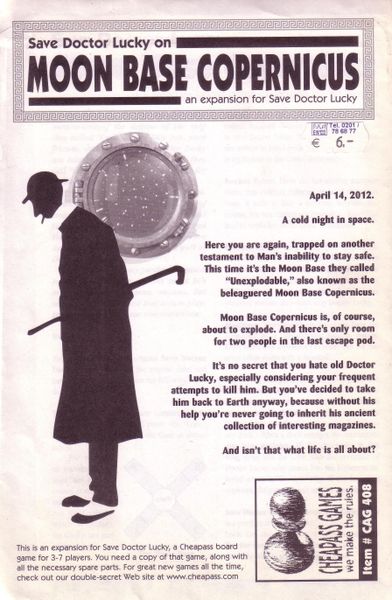 Save Doctor Lucky on Moon Base Copernicus is an expansion for the base game, Save Doctor Lucky, which was originally released in 2002 by Cheapass Games. This expansion adds a new setting to the game, taking players to a science fiction-themed moon base where they must continue their efforts to save Doctor Lucky.