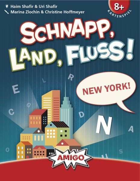Schnapp, Land, Fluss! is a German word game that was released in 2002 by AMIGO. It is designed by Haim Shafir and Uri Shafir and features artwork by Oliver Freudenreich, Christine Hoffmeyer, and Marina Zlochin. The game falls under the categories of Action/Dexterity, Card Game, Children’s Game, and Word Game.