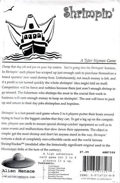 Shrimpin’ is a card game released in 2003 by Alien Menace and Mythrole Games. It is designed for 2-6 players, with a runtime of around 90 minutes. The game is recommended for players aged 13 and above.