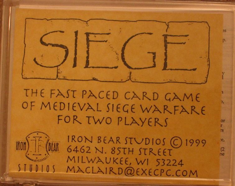 Siege is a two-player card game released in 1999 by Iron Bear Studios. The game is set in a medieval theme where players take on the roles of rival factions trying to siege each other’s castle. With a runtime of 30 minutes and suitable for ages 10 and up, Siege has become a popular choice for fans of card games and medieval settings.