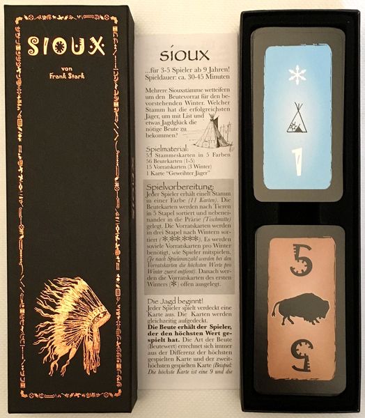 Sioux is a card game released in 2006 by Heidelberger Spieleverlag and Nürnberger-Spielkarten-Verlag. It is designed for 3-5 players with a runtime of 45 minutes and is suitable for ages 9 and up. The game falls under the category of card games and features the mechanism of open drafting.