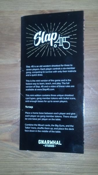 Slap .45 Mini is a fast-paced card game set in the American West, designed by Kellan Jett and released in in 2014. The game is centered around player elimination and simultaneous action selection, making for an exciting and unpredictable gameplay experience.
