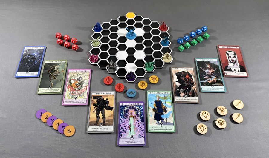 To set up Sodalis, players first select their champions and begin by building their decks. Each champion has specific abilities and starting cards that will influence the initial deck composition. The game board, representing the solar system, is then prepared with each player’s home planet marked. The tarot-inspired deck is shuffled and distributed according to the game’s rules. Players then ready their champions for the arena-style skirmish that follows.