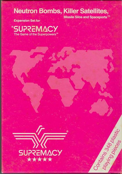Supremacy: Neutron Bombs and Killer Satellites is an expansion for the base game Supremacy, released in in 1988. Designed by Supremacy Games, this expansion adds new elements to the original game, focusing on modern warfare with the introduction of neutron bombs and killer satellites. It is a wargame that allows 2-8 players to engage in strategic battles to dominate the world.
