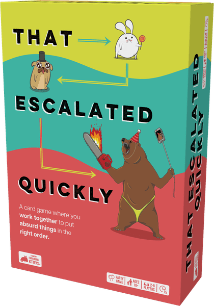 That Escalated Quickly is a party game released in 2024 by Exploding Kittens, known for their quirky and fun games. The game is designed for 2-8 players and is best played with 4 players. It has a cooperative game mechanism, where players work together to achieve a common goal.
