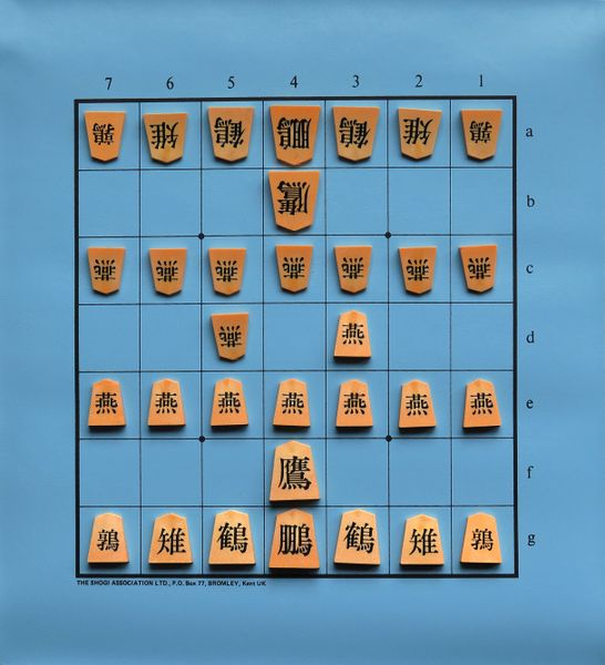 Phoenix at d1 and d7Quail at a1, g1 and a7, g7Pheasant at b1, f1 and b7, f7Crane at c1, e1 and c7, e7Falcon at d2 and d6Swallow pieces spread across the third and fourth rows for each player.