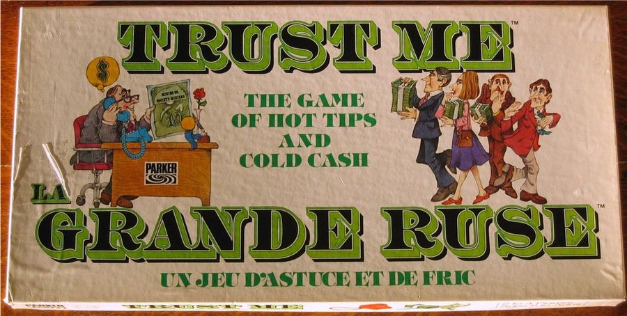 Trust Me is a board game that was originally released in in 1981. It was designed by the D’Arcey brothers and published by Parker Brothers. The game is categorized as a bluffing and economic game, where players engage in betting and bluffing, commodity speculation, and stock holding.