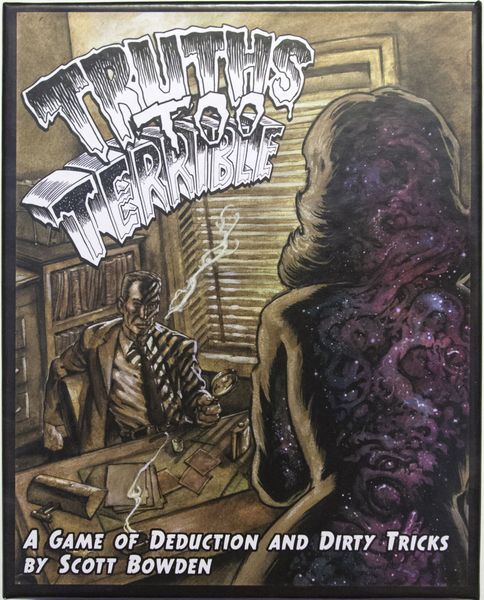 Truths Too Terrible is a horror-themed card game designed by Michael Dubisch and released in in 2015. The game is meant for 2 to 4 players and has a runtime of around 30 minutes. Players are tasked with uncovering dark truths and secrets in a Lovecraftian world filled with eldritch horrors.