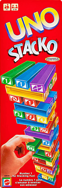 UNO Stacko is a variation of the classic card game UNO, first released in in 1994. This dexterity and stacking game combines elements of UNO with the challenge of balancing and stacking blocks. Designed by Jim Keifer and published by an unknown publisher, UNO Stacko has become a popular party game for players of all ages.