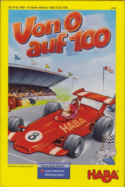 Von 0 auf 100, or “From 0 to 100” in English, is a board game designed by Dominique Ehrhard and published by HABA in in 2005. The game is a combination of bluffing, children’s game, and racing, making it suitable for players of all ages. The objective of the game is to move your car from 0 to 100 on the score track without being caught bluffing by your opponents.