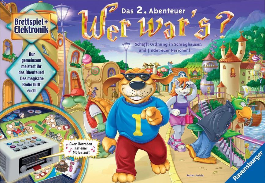 Wer war’s?: Löst das Rätsel von Schräghausen! is a board game designed by Reiner Knizia and published by Ravensburger in in 2010. It is a children’s game that combines deduction and electronic gameplay elements. The game challenges players to work together to solve a mystery in the town of Schräghausen.