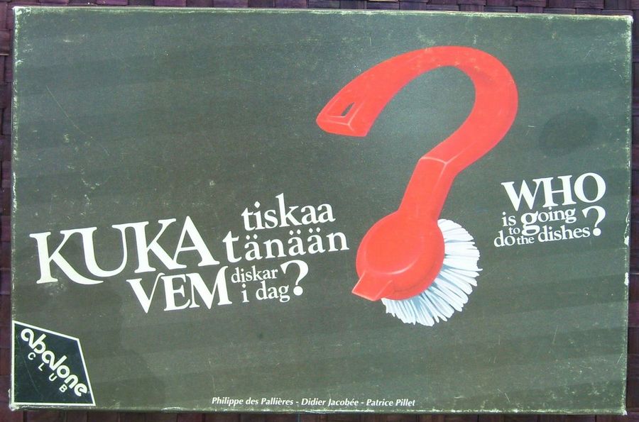 Who Is Going to Do the Dishes?’ is a board game released in 1991 by Abalone Games. The game was designed by Philippe des Pallières, Didier Jacobée, and Patrice Pillet, with artwork by Cyril Chedeville, Thomas Guidez, and Pascal Trigaux. This card game falls under the humor category and involves hand management and open drafting mechanisms.